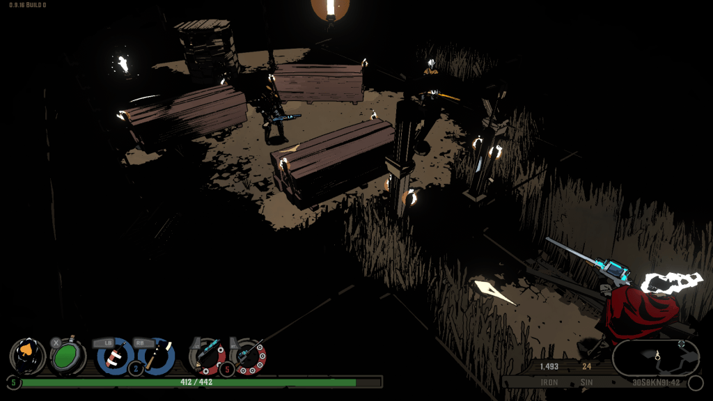 While relying heavily on tested titles like Dead Cells, the twin stick shooter’s weapons are delightfully chunky and powerful. The weapon selection is numerous among its four categories: Revolver, Pistol, Shotgun, and Rifle. Collected Sin from fallen enemies can be traded with a mysterious Witch to unlock your arsenal, each displaying different variations to suit almost every style. Mason can also hold two secondary items, which range from hard-hitting offensive items like axes and dynamite to defensive items like shields and lanterns. Rounding out a completed build are charms that can add passive abilities such as extra HP from healing items, or regaining lost health by hiding behind cover or inflicting damage on enemies.