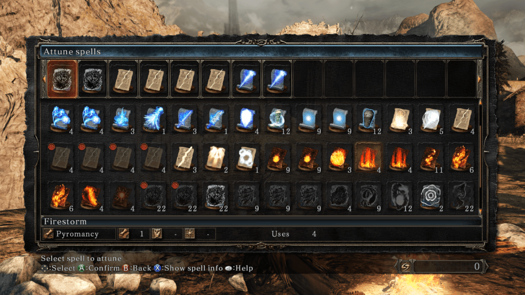 Dark Souls II stands as the only title to forgo mana for its sorceries and miracles and instead supplies a number of uses to each slot. This omission speeds combat up, with only stamina and weapon durability being pressures against a flow of damage. If you like a specific spell? Stock up and fire away (66 uses of Dark Orb is a grand ole time). At full attunement and with some help from rings you can hold up to 14 slots of spells, giving your character an absurd range of over 100 spells to choose from. You feel like a real sorcerer cycling through different types of damage as you face each batch of enemies, no longer stunted by the constant drain of mana.