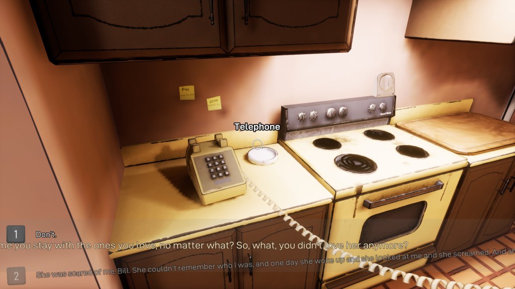 I mentioned at the end of the review proper that Adios made me cry. It was the phone call with the farmer’s son Bill that did it. Part of this was due to it resonating on a personal level as I’ve lost a lot of family in similar ways, but I don’t want that to diminish how effective I think this scene is at laying the core of the farmer’s character bare. Bill is a victim of the farmer’s commitment to the mob’s deal despite it being taken to save his life to begin with. He had to track his suffering mother down in a nursing home that the farmer put her in despite his wishes. She was lucid, he says, though knowing Alzheimer’s that was almost certainly momentary. The farmer thinks as much but can’t bear to tell his son (represented by a grayed out dialog option), remembering moments where she reacted to him with fear because she didn’t recognize him.