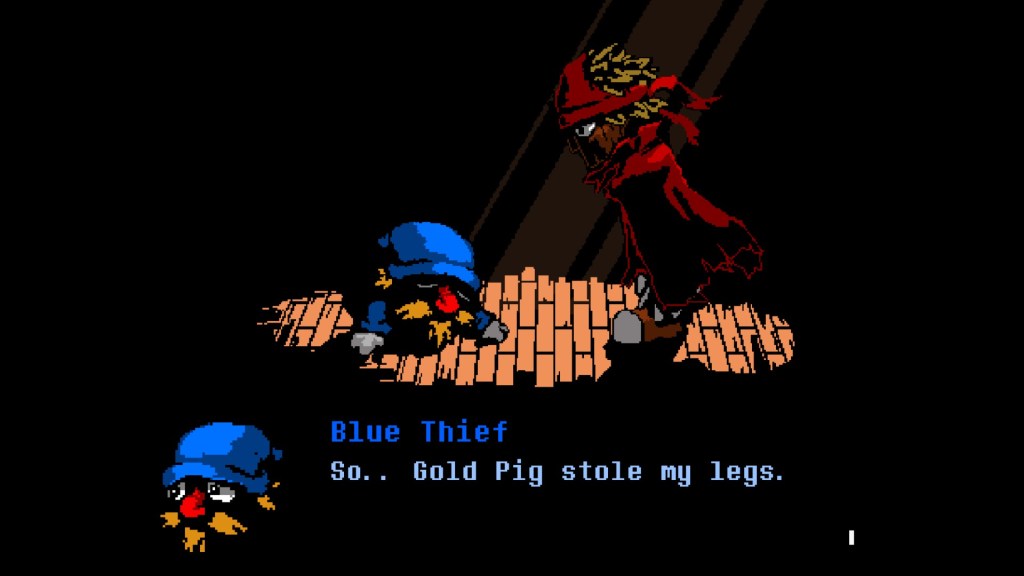 Everhood at its most simplistic can be described as a rhythmic melting pot of Undertale and SHMUPs ala Mushihimesama. A mute, wooden doll dubbed by the name of Red has their arm stolen by a mustached thief in blue. When Red confronts the thief, a purple pig clad in gold hands him a sentencing to the incinerator. When death has decided it’s not Red’s time they go on a quest to retrieve their arm and find out along the way what their quest really is.