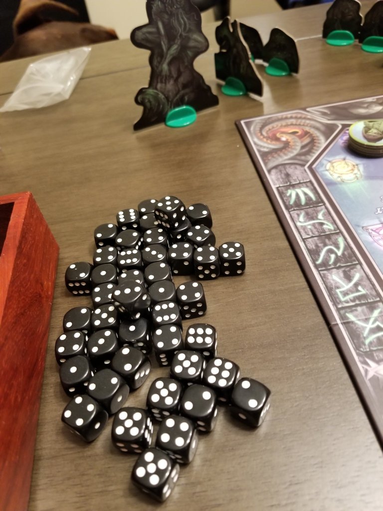 From a production standpoint the game is, as intended, less ostentatious than the original. We’ve got a much smaller box, board, and standees instead of plastic totems. The art on them is a bit dark but the silhouettes are distinct so it makes identifying which creatures are which easy, doubly so if you’re used to CW already. There was a strange choice to include a total of 10 dice when the game easily has individual sides rolling more than that during big fights, so we chucked in some extras to avoid having to remember how many kills and pains we rolled. Beyond that, no complaints. It’s an excellent smallification of CW while retaining its sense of scale and the prospect of actually being able to take it places is an exciting one.