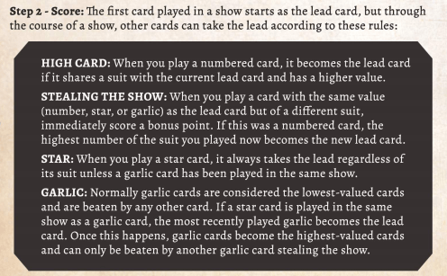 This flying by the seat of your pants gameplay is oddly incongruent with the rock-paper-scissors element the game is hinged on. Each suit contains seven cards: #1-5, a star, and a garlic. The first card determines the lead, but since there’s no following it just means high card/suit. Stars steal the lead regardless of color and beat all numbers. Garlic is useless on its own, to the point where if a garlic is the lead it basically doesn’t exist, but it beats stars outright and becomes the strongest card if one is present. Couple that with the ability to “steal the show” for an instant point and a lead change if you ever match the lead card’s value (including symbols) and it’s a surprisingly intricate system that’s interesting to parse in play.