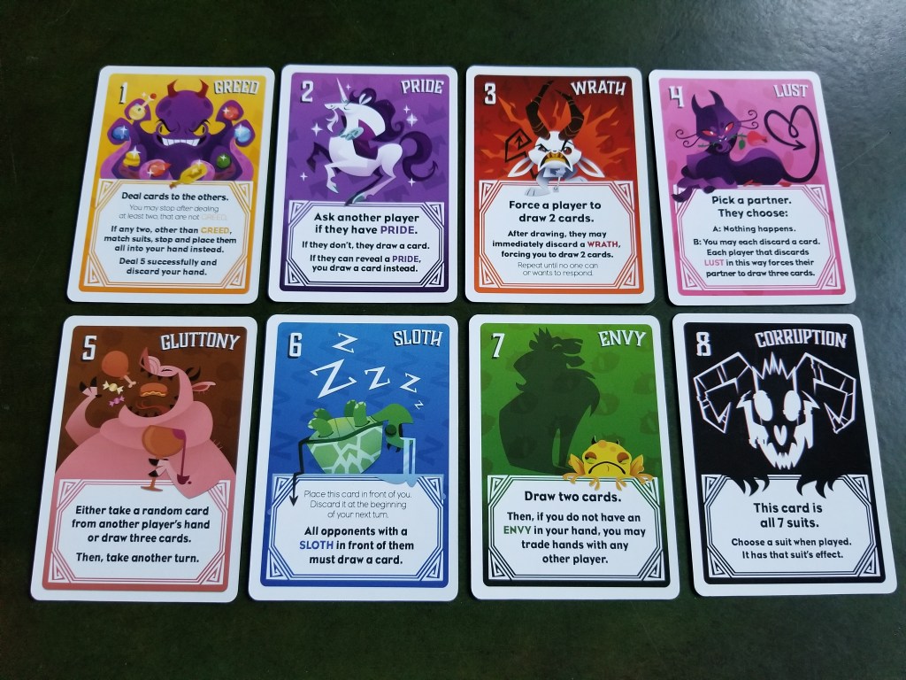 On its surface The Deadlies is a card shedding game. There are seven suits representing the seven deadly sins numbered 1-7, plus a single wild card (Corruption) at 8. Very cute theming. Make a combination of cards (a straight, a matching set, etc.) and toss it from your hand, the more the better. If you manage to empty your hand it’s refilled again, but with fewer cards. Do that three times and you win! It’s simple, or it would be if every card didn’t also have text on it. Or more accurately, each of the sins has its own minigame with varying stakes that you’ll have to play if you want to get those cards gone.