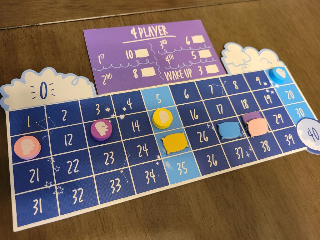 I wouldn’t call ST a push-your-luck game as much as I would a racing game, but both are so intertwined that neither would be wrong. Your initial goal is to get 40 winks (points), represented by moving your head token along until it hits your pillow token. Adorable! Rather than just make your way down a track to the finish line you’re competing in heats. Depending on how well you do you’ll earn the right to pull your pillow closer than everyone else, meaning in future heats you’ll have an easier time achieving that snooze and winning the game. Maybe you have a banger of a round and as a result you only need to get 30 winks to win the game next round, for example. The highest points of tension are the rounds where your pillow juuuuuuust barely looks reachable, where a win coooooould happen, where you miiiiiight be able to make it if the cards hit just so. You may be able to steal a win before anyone suspected and look cool as hell to all your friends, but it’s just as if not more likely that you’ll be left with nothing but a bad night’s sleep.