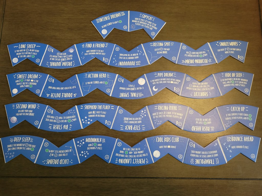 When the running is done, regardless of outcome, everyone gets a short rest phase that’s equally brilliant. All those funky shaped wedge spaces need abilities on ’em and you’re the ones who get to decide what those are. Rather than force some kind of currency or bid into the mix, ST just offers an embarrassment of riches to its players and challenges you to choose carefully. Tiles you add will be pre-stocked with your Zs, potentially even an infinite supply, meaning you’re set up to use the tile you select over and over as the game goes on. But it’s still available to your opponents, and if they feel especially clever (or, y’know, the board is full) they can just take Zs instead of popping down a tile to immediately piggyback off of your decisions. As far as drafts go it’s as swift as it is smart, fundamentally impacting the rest of the game with a decision that takes mere seconds. Investing in particular powers is critical, but which ones? Do you want to intentionally spook your sheep for free winks? What if you could also land on a tile that made them brave again? Maybe a movement tile that could bounce you into other tiles for some proper comboing? Or my beloved Pipe Dream, a tile that has never once worked for me but tempts me every time it comes up with its promises of vast riches? There’s nothing you don’t want! Make it count.