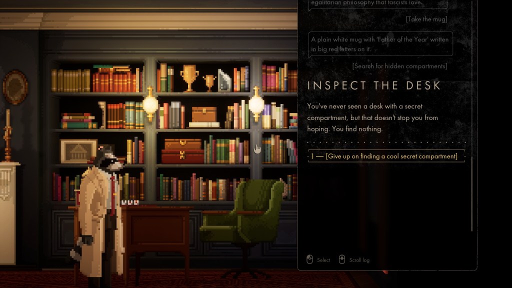 But as each act moves forward, the steam starts to dissipate and EggNut seems to be unsure how to stick the landing. Puzzles disappear and the pace runs on auto-pilot, the aforementioned options of text do little to nothing to change the emotion of you or the characters spoken to, and what started as a promising point-and-click neo-noir adventure becomes a slightly more involved visual novel that clearly ran out of time and was left with a list of failed promises like a too-good-to-be-true Kickstarter campaign. By the time Act V comes along, you feel like you’re playing a completely different game and then it just…ends, and you’re left with this conjoined feeling of confusion and frustration.