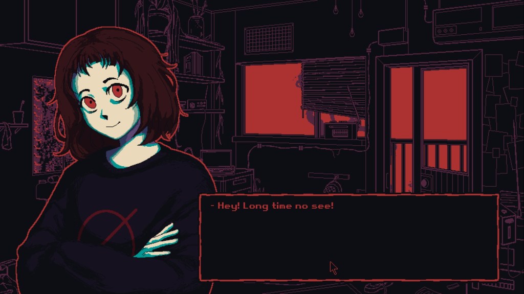 While Milk outside a bag retains the original’s structure of a visual novel drizzled in sullen neon tones and a molasses thick atmosphere, the sequel adds some depth in traversing Her room as a point-and-click adventure, much to delight of Her, seeing as this was her idea. Notebooks with half drawn but fully criticized scribbles, plants that have needed to see the light of day for longer than She has, the l̸̞̜͌́̈͆̍͒̕͜͝͝ą̴̪̹̺͓̥̱́͑̐̎͒̃̐̿͆̎̚p̶̩̘̥̍̾͋̔̍̒̋͌̃̾̔̎̕̚͜͜t̷̡̡̝͎̳͓͚͔̉̿̋͗̀͜o̷͕̱̟̮̱͉͎̙̻̾͌̔̆͌̉̎̔͘p̴̨̨̮̮̙͖̠͐́̐̔̍̓̋͒̀͗̿͂͠͝ that stays plugged in but She doesn’t know why. Each part of her room places a puzzle piece in the center of the table, but She will turn each piece counter-clockwise to skew the final picture. You want to learn more about Her, but She doesn’t want that.