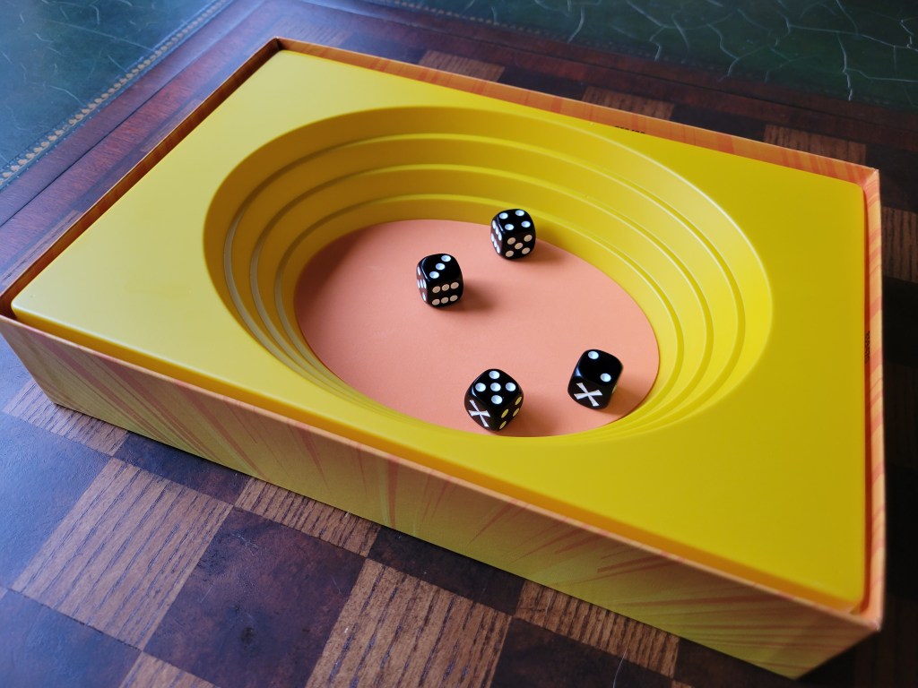 And again, we’re back to talking about what kind of game this is. Since you can bump other dice around with a good toss but bouncing the die out of the arena means you lose it, does that make this a dexterity game? Sure, I guess so? But I’m not convinced that being especially dexterous grants any special advantages. At the end of the day it’s still a die roll, y’know? And any die is capable of coming up X, complete with your friends making the Price is Right loser horn noise. Sometimes that happens 3 times in a row! Pain!