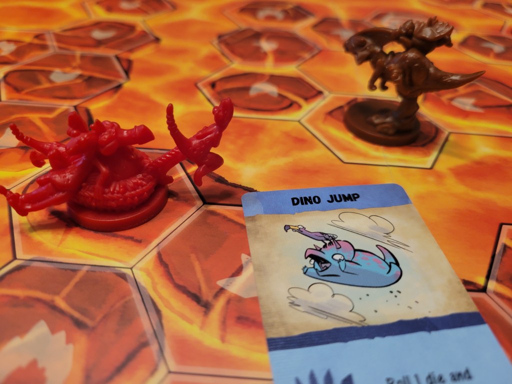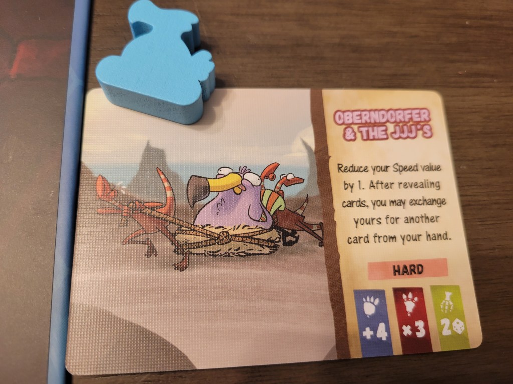 So far if you wanted to be unnecessarily reductive you could call this a take-that card game with a board, and I suppose that’s correct to some degree, but that changes considerably once the wooden bits come out to play. If the deck of cards is DRD‘s heart, keeping everything alive and functional, the items are its soul. Many cards have players making use of the game’s actual physical items to attack opponents, and this is accomplished via various dexterity challenges. From the humble egg, flicked from the racer’s spot on the board like Mario Kart‘s green shell, to the mighty meteor dropped from at least a foot above the board onto the noggins of unsuspecting dinos (ala Snowboard Kids‘ pan item, which may only mean anything to me in the year of our lord 2022), each of them is capable of inspiring moments of held breath for the entire table. Firing at the racer in the lead is standard practice but some attacks offer the shooter benefits for multi-hits, meaning there’s potential for interesting choices if your dex skills are up to snuff.