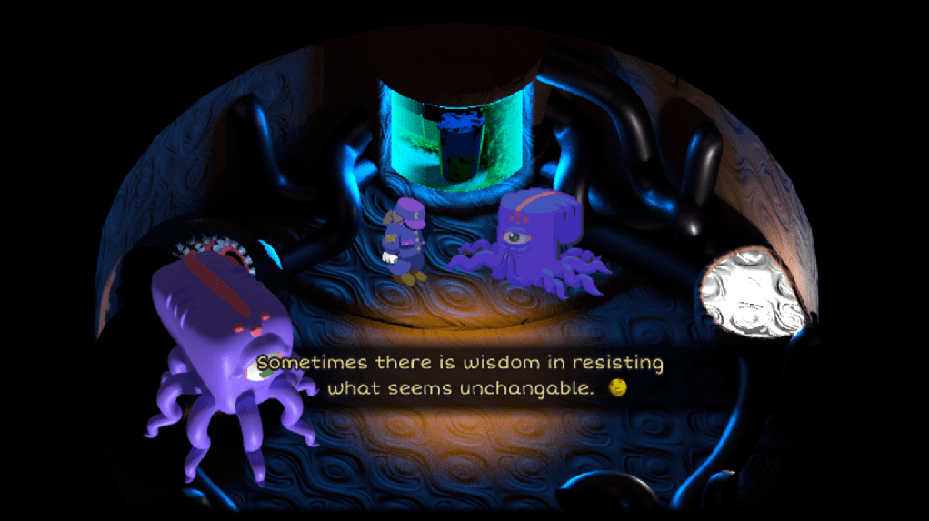 Describing 24K as an actual game is…tricky. You play as an angry spirit named Home who’s been forced to pilot a corpse against their will by an alien named Moon (I refuse to believe this name is a coincidence). The purpose of this is twofold: to force Home to help rescue a bunch of weird critters stuck underground on your abandoned island, and also to help save Home from themself. That part’s more complicated and I’m not gonna explain it here. Suffice to say you’ll make friends or try again the next day. Because you can’t die, see.