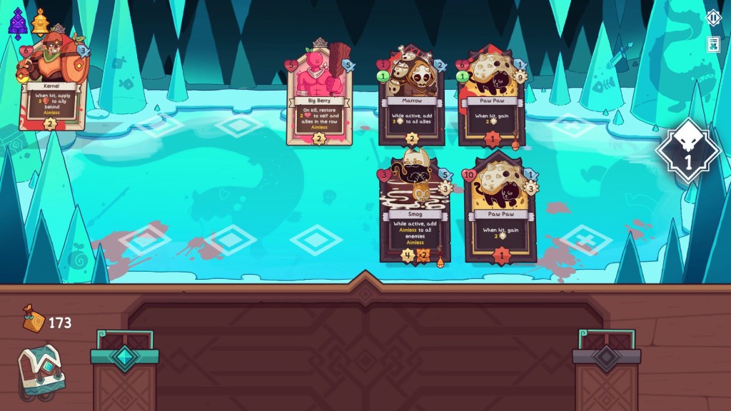 This lack of information is only the beginning of Wildfrost seemingly withholding functions that we’ve come to expect from the genre. Units added to your band are chosen from a draft of 3, which is fine as you can just bench units that don’t fit your squad, but the same convenience is not present for cards. Any addition of cards to your deck that isn’t a purchase from a shop is a gamble as you very likely will hit 3 you don’t want and, unlike almost every other roguelike DB’er I’ve played, you cannot simply turn them down. You must add one, diluting your deck’s effectiveness. The only way to cull cards is by visiting the cull event, which has a very real chance of being on an otherwise useless path or just not showing up when you need it. I need to emphasize: you can not plan in any significant capacity. All you can do is try to make the smallest, most powerful deck possible and hope that its bad matchups don’t show up.