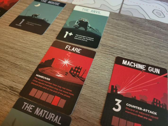 Well it’s very different, for one. We aren’t doing suits and numbers here – this is a solo skirmish played on a grid, very much in the popular “put out the fires” coop/solo mold if you’re familiar with board games like Ghost Stories or Pandemic. Bad things are added to the table at various coordinates, you take actions with your squad, then the bad guys try to shoot your boys. The goal is simple – keep the board as manageable as possible until the threat deck runs out, then clear all the baddies in one last hurrah or die trying.
