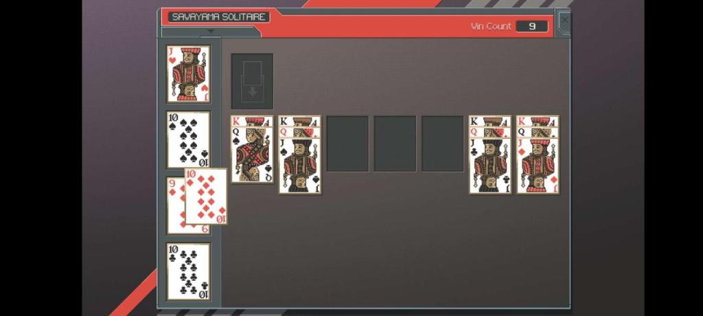 Hell yeah I am. Sawayama is an in-universe riff on classic Windows Klondike as per the description, and it improves on its inspiration in every possible way. Great visual presentation, some fun mechanical changes that force you to approach it differently, and my favorite music track in a collection with several winners. Playing Sawayama feels like you’re a high power executive of the retro-future that’s been promoted to the point of not having to work anymore, and now your greatest challenge is getting a win or two in before heading out for your 2:30 low-grav golf game.