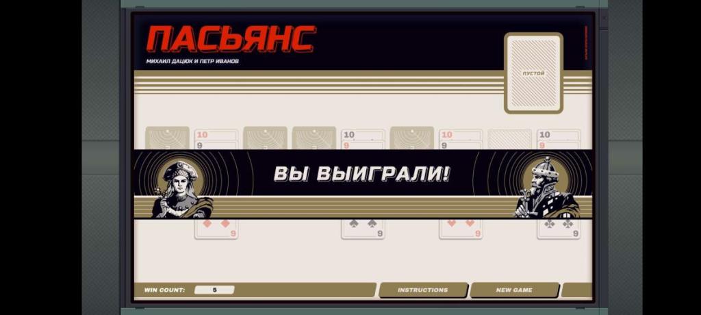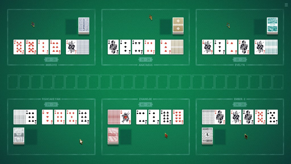Cluj is by far the most visually striking game in the collection by way of sheer minimalism. Once again we have the Russian deck, only this time it’s divvied into 6 columns and actually uses the original 4-royal set: Tuz, Korol, Dama, Valet – TKDV. Remember TKDV. Repeat it. Tattoo it like Memento, burn it into your brain, because you’re going to be muttering it under your breath like a madness mantra as you play.