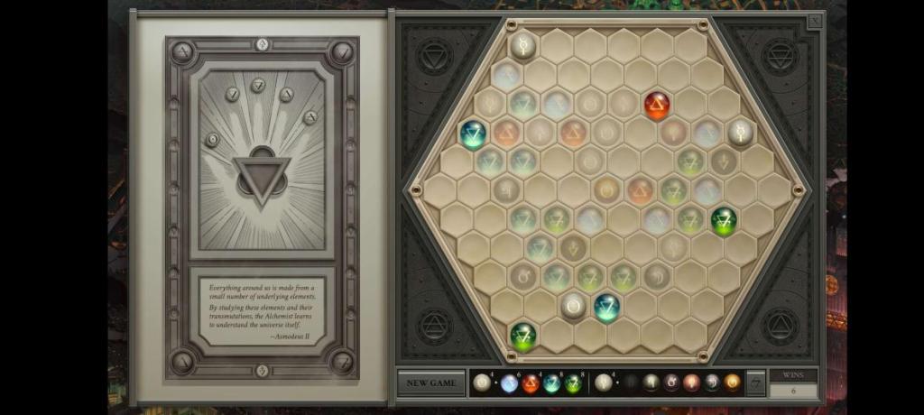 Gameplay-wise you have a hexagonal grid filled with alchemical candies. Your goal is to match two at a time, eating them and freeing up more candies for matching, eventually culminating in isolating the delicious golden candy at the center. It’s somewhat similar to old school mahjong solitaire but without the 3D stacking aspect. What you see on the board is all there is, and that’s both its greatest strength and weakness.