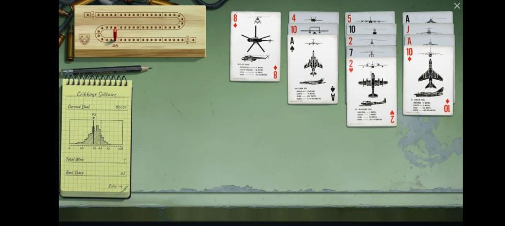 I didn’t grow up in the midwest. As a result I was introduced to Cribbage as an adult card game enthusiast. It’s a strange game, far more interested in leveraging its esoteric scoring rules to the fullest to steal points from your opponent than cardplay itself. Cribbage Solitaire retains this concept, but for solitaire, and the lack of another human feels quite noticeable.