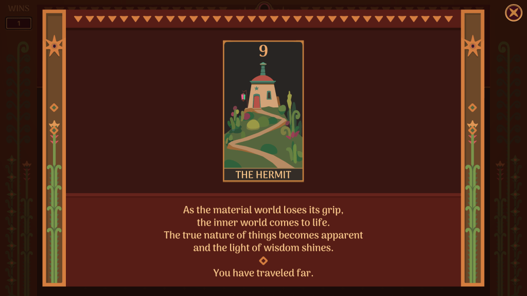 That restriction is only the first of many. Need a free cell? Sure, just drop a card at the top of the board! Just keep in mind that doing so means you can no longer stack minor arcana to remove them from the board so you can get to the majors you need to actually win. You can pull that card back down, but be extremely careful to vacate that spot as soon as possible or you will get stuck. Repeatedly. This is the only game in the collection with an undo button, but one step back will not save you as often as you’d hope.