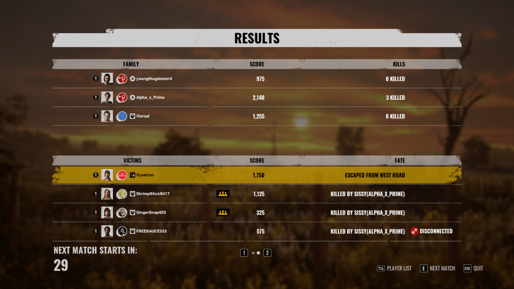 One of the best ways to summarize the wonky side balancing is to talk about Grandpa Mechanics ™. If there is one thing about this game that will never leave my memory it’s the existence of Grandpa and his wide array of gameplay implications. Blood is collected from buckets littered around the map as well as victims upon hit, and gathering it all can be a fairly lengthy process. This blood can be fed to Grandpa, who rewards his progeny for delivering his Postmates by emitting a guttural roar that acts as sonar. The more you feed Grandpa the more powerful and effective this becomes, culminating in permanent UAV by level 5. A tangible advantage for the family! How do the victims counter this? By quickly stabbing Grandpa in the thigh with one of the infinitely respawning bone shards, at which point he alters his grandkids of his assailant before sleeping off the stab wound and immediately losing at least one tier of Grandprogress. Would it shock you to learn that there is currently a perk to make Grandpa lose up to 4 levels with a single drive-by? It shouldn’t! This is just how the game works!