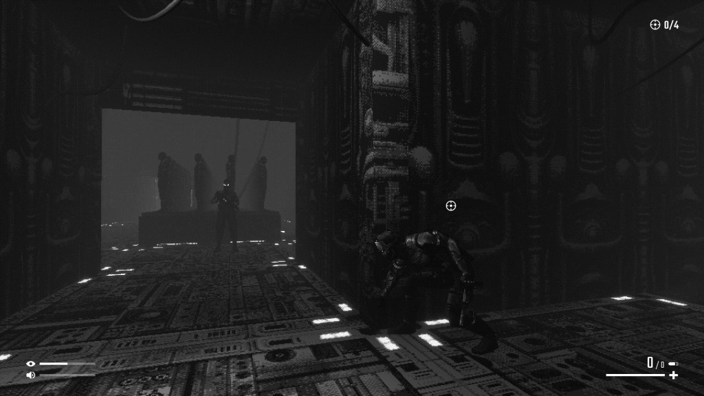 Levels do not have checkpoints. In each of the game’s 6 levels is expected to be done in one life and largely devoid of enemy contact. Levels involve tight corridors and numerous guards that hurt a lot. Most enemies will take you down in 2-3 bursts of shots, and if they have line of sight on you they are not missing. They have perfect aim (you very, very much do not have this luxury) and will follow you an incredible distance if seen and alerted. If you die, back to the start of the level you go. This requires you to be very patient, learn enemy patterns, and know when the best time to kill a guard will be. This also puts you on constant full alert so seconds feel like minutes and each level being around 15-20 minutes long is mentally exhausting. So when you happen to get caught in the corner by a guard or spotted if they turn around too fast or you didn’t tag them previously (done by aiming at a guard for a quick second) and don’t know where they are since footsteps are your only indicator, you will get shot, and you will die. And it’s back to the start of the level you go again.