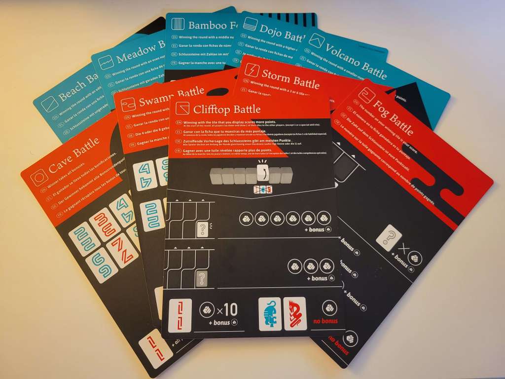 T&D builds on this foundation in several notable ways. Most obvious are the Mahjong-esque tiles, giving players even chunkier pieces to clack down. Very satisfying. There are some player boards, and while they aren’t strictly necessary they help keep the table organized and legible. The tiles themselves have made the jump from Shogi to more broadly understood numbers with a pyramid distribution: eight 8s, seven 7s, a single 1, you get the idea. There are also exactly two special tiles, the titular tiger and dragon, but we’ll get to those later. The game now supports a range of player counts, going from 2-5 while still supporting the traditional 2v2 game. Finally for segue purposes, we have the battlefield cards. These are what elevates the game from “Goita riff” to its own duo of beasts.