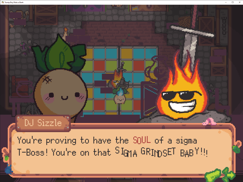 Turnip Boy Commits Tax Evasion plays like an old school parody flash game, with constant walking back and forth between NPCs trading items and not much else. When the game does present gameplay there’s very little to it. Despite being maybe 3 hours long it still feels like too much; too much walking, too much waiting, too much talking and not enough laughter even when it’s in its best moments. Turnip Boy Robs a Bank, to its credit, does not play like a Flash game. Instead it plays like Enter the Gungeon with a splash of Phantom Hourglass. And it’s fine. Again. But once again I’m left soured on the experience, because I am a joyless jerk.