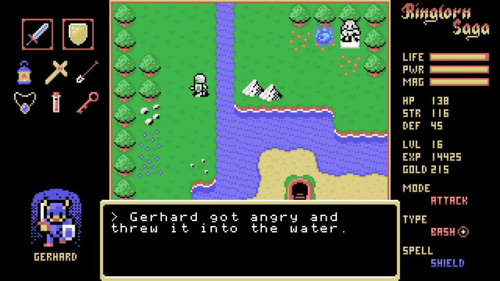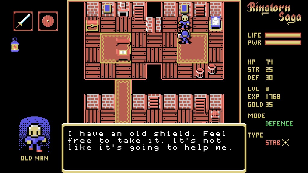 Make no mistake, this isn’t just a game borrowing a retro aesthetic. Everything hurts in Ringlorn Saga. Basic enemies can easily wallop you for most of your health if you get careless or complacent as everything scales with your level. You can never afford to stop paying attention. Be ready to gearshift to defense mode whenever you aren’t swinging your sword, memorize your opponents’ weaknesses, and learn how to shimmy around your opponents. Float like a butterfly, stab like a knife.