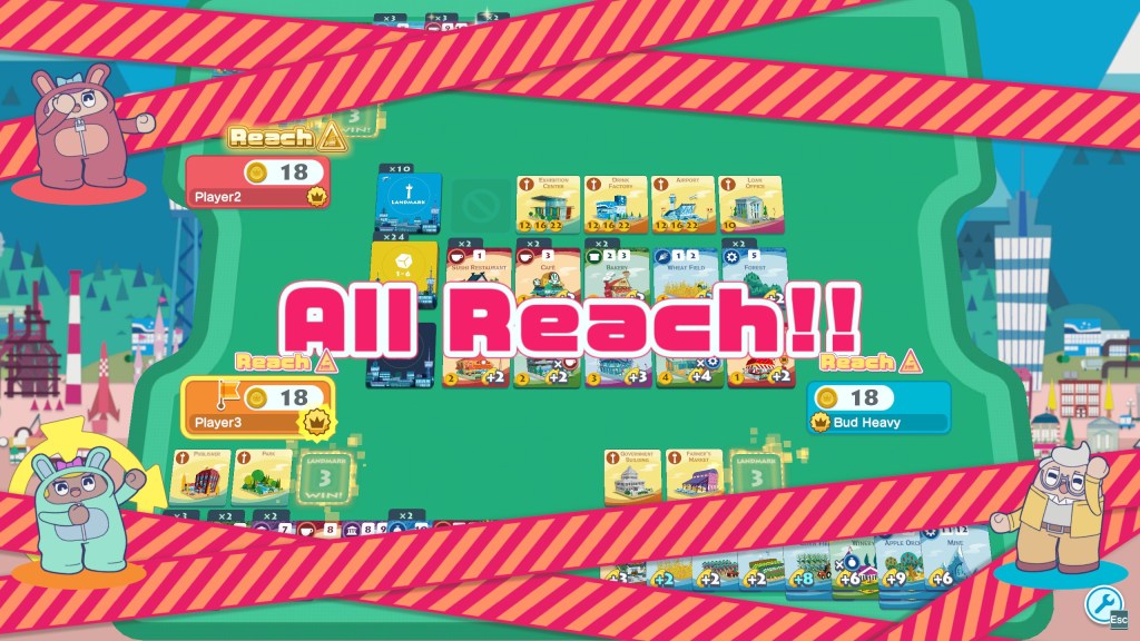 The presentation here is as charming as it is noisy, both in the audio and video departments. You’ve got stumpy lil characters flailing their arms around, emoting all over the place, complemented with all sorts of music cues. My favorite by far is the song that kicks in when a player is at “reach” (one landmark away from winning). I’ve heard some folks say they find it a bit too busy, but none of it impacts the legibility of the game so I’m inclined to enjoy it.