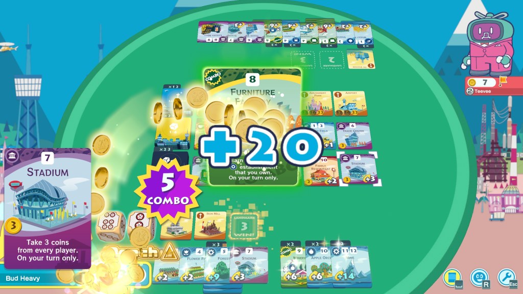We love us some Machi Koro here at Pixel Die. Of all the board games I’ve had the pleasure of introducing Kyle and his household to, MK has taken the strongest hold and it’s easy to understand why: it’s all the tactical decision making of a city-builder combined with the thrills of a high-stakes game of Craps. MK sees so much play over there that when Pandasaurus released Machi Koro 2 it led to him venturing into what’s normally my territory, appreciating it for its speed but doubting its longevity when compared to its expanded original. Now Grounding (the original Japanese publisher) has released the official digital implementation of both games as Machi Koro With Everyone, so it should be an automatic recommendation from us, right?