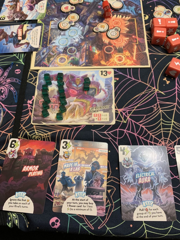 While I respect the willingness to alter a design to the point where its namesake is all but gone, what we’re left with lacks any of the tension or emotional highs of the original. Everyone who’s played KoT has experienced that moment where they’re on low health outside of Tokyo, accidentally roll a claw, and are forced to eat the next punch from the peanut gallery as the current hill-haver cedes it to them whether they want it or not. It’s a major source of the game’s comedy and table-talk, and its absence is strongly felt. Gone are the emotional highs of King of Tokyo, and all we have to show for it is dry tug-o-war.