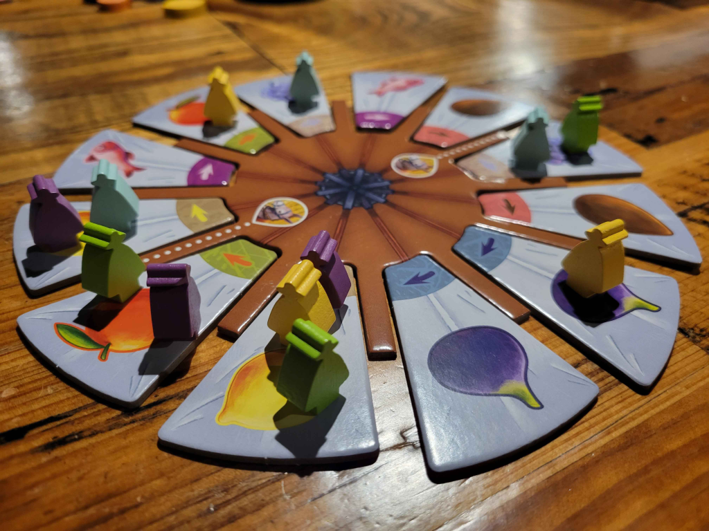 Finca’s claim to fame is its rondel. Your farmer pawns move clockwise around the blades of the windmill, each of which is marked with some sort of good. It works kind of like a multiplayer version of Mancala. How far do they move? As many spaces as there were farmers on their spot. How many fruits do they get at their destination? As many as there are farmers on that spot. Easy peasy oh god there’s lemons everywhere.