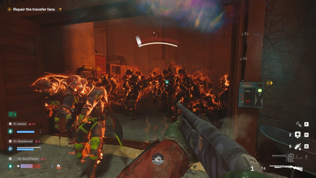 Let’s talk structure for like, 2 paragraphs. Firebreak typically sees you taking on 3 act missions that take 20ish minutes. Think of it as a truncated version of L4D’s safe room airlocked sections, but instead each section is connected and walkable. Each map chunk gives you an objective from a short list of possibilities. For example, an area with a payload cart could either task you with collecting irradiated rocks and chucking them in, or ignoring the rocks entirely in favor of blasting all the rock-producers. Once your objective is done you can open the door to the next one. Repeat until you’re at 3/3, then it’s time to bail all the way back to the start of the map and extract via elevator. All of this menial labor is made more challenging by endless hordes of Hiss, as seen in the hit game Control! Branding! Synergy! Remember Control? Remedy sure hopes you do! Unfortunately for them my experience with that game was getting about halfway in before hitting a game-breaking bug on the console version soon after release, and that game’s combat was by far my least favorite part, so you’ll have to forgive me if I don’t know who any of these goobers are. Also they added a wave mode in the most recent patch, but it’s shallow and not particularly worth talking about.