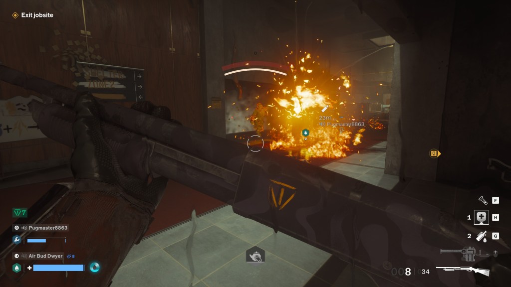 Anyway! The rest of this game’s bones lie in character building. Almost every co-op shooter is laden with a perk system now and Firebreak lands on the more complex side of the fence. Not quite a Darktide but notably more involved than a Helldivers 2, for reference. You can build all kinds of wacky shit but what I find most interesting is how the progression is split. Your character level governs your perk access, but the 3 work kits level separately (to a low ceiling of 9), and that dictates how many perk slots you can bring on a job. Loadouts are a single customizable gun, which isn’t kit restricted, and a support tool that very much is. In summary: you do missions to gain levels to upgrade your goober so you can do harder missions. You’ve played this sort of thing before, and it’s done pretty well here, especially considering they apparently upped the XP gains from what was once gruelingly slow.
