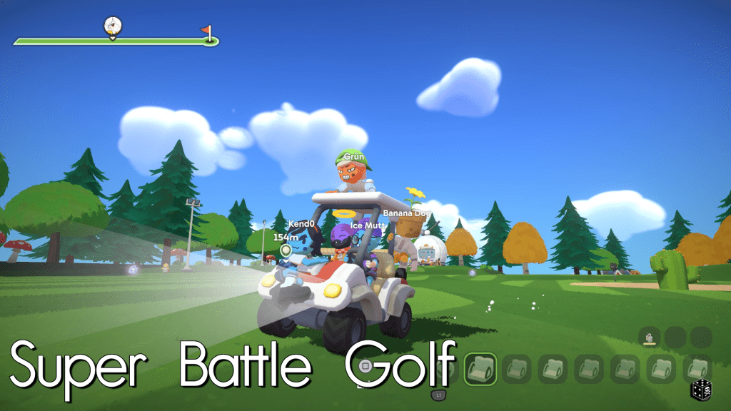 Take the concept of Mario Golf Super Rush‘s Speed Golf mode and combine it with a bevy of items ranging from cups of coffee to spring boots to elephant guns to a Hammer of Dawn. Golf games! SBG‘s standard mode is a 9-hole race to the finish, where the amount of strokes is second banana to just getting in the hole as soon as possible. Your swing’s power is handled by a hold-and-release method: hold your swing button and release at when your power is where you want it. No fancy spin on your shots is available but you can tweak the angle of the one club you’re allowed to use: try 0° for putting, 10° for low and fast stingers, 45° for your normal drives, and 60° to loft high and remove excess rolling after landing.